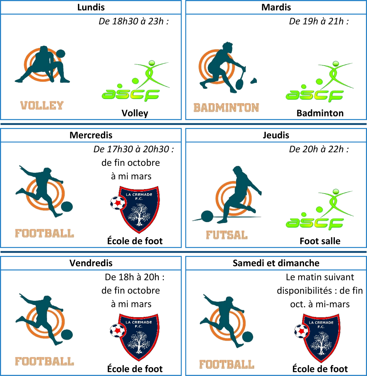 Voici un tableau présentant les occupations hebdomadaires de la salle par les associations sportives pour la saison 2025/2026 :