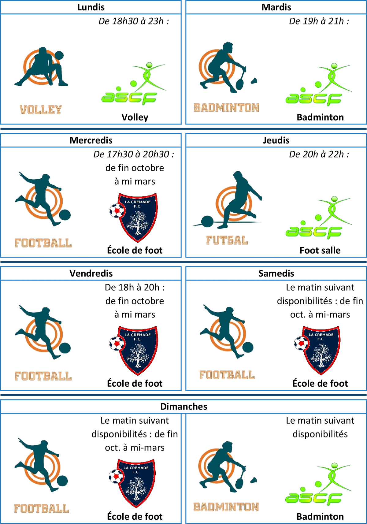 Voici un tableau présentant les occupations hebdomadaires de la salle par les associations sportives pour la saison 2025/2026 :